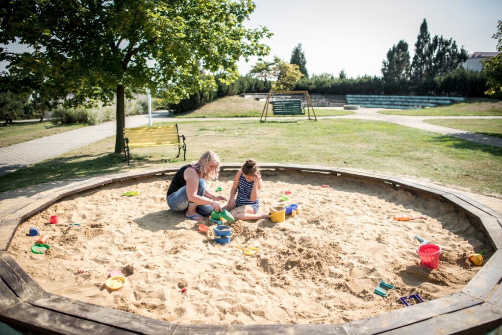 Dětské hřiště pracuje s kombinací klasických herních prvků a modulací terénu. Je určeno pro malé i větší děti. Do plochy hřiště umisťujeme lanové prolézací prvky a zapuštěné pískoviště. Kolem kmenu kaštanu se opět vine kruhová lavička.