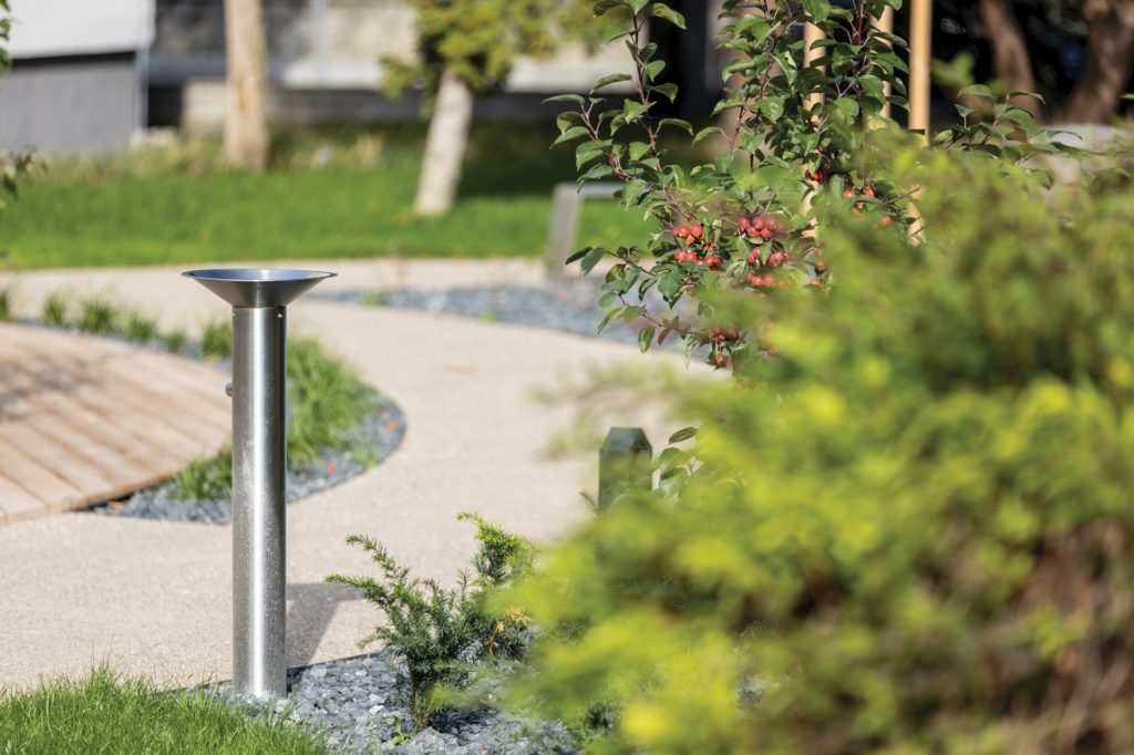 Hlavní cestu procházející parkem vnímáme jako jakousi metaforu hlavního proudu elektrického vedení, která jde velmi racionálně a efektivně nejkratší trasou i v rámci zařezání se do terénu, tu lemuje z jedné strany zídka z probarveného betonu, která se „vlévá“ taky do altánu.