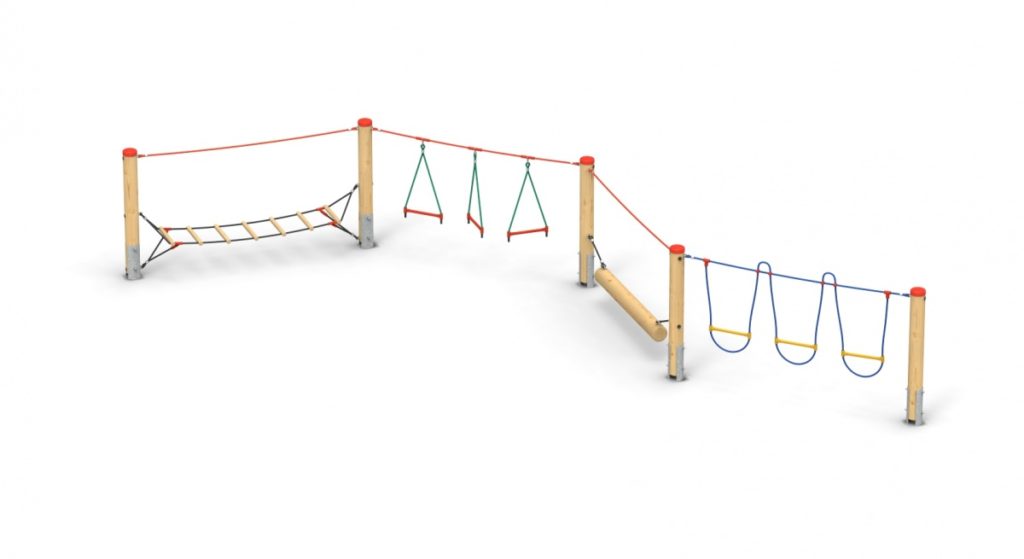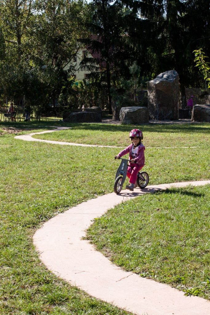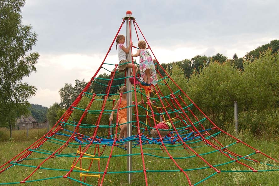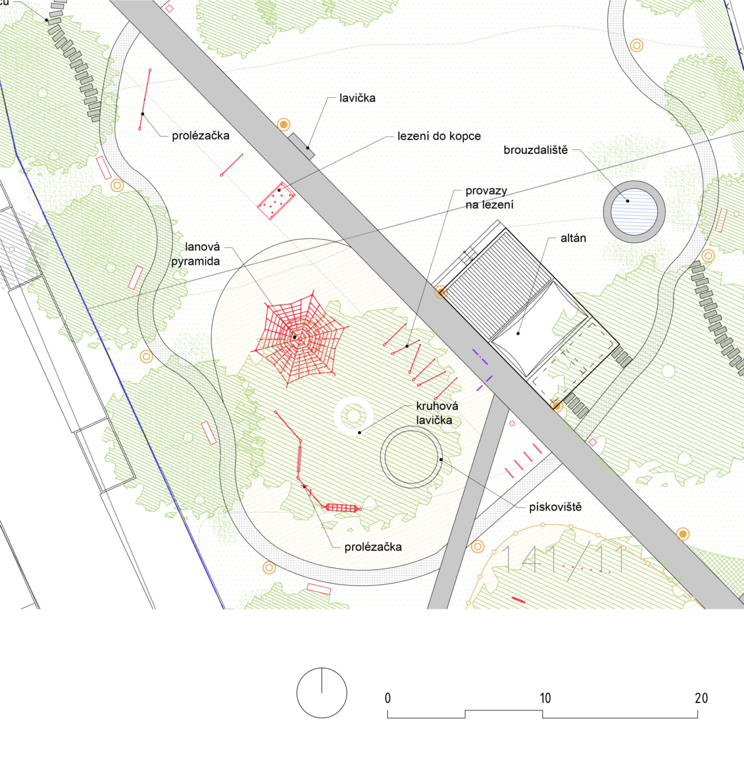 Volně v trávě se také nachází další lanové i deskové šplhací prvky, neboť je zde mírný kopeček směrem od trávníku k cestě. Ve volnější části parku za altánem najdeme také mělké brouzdaliště.