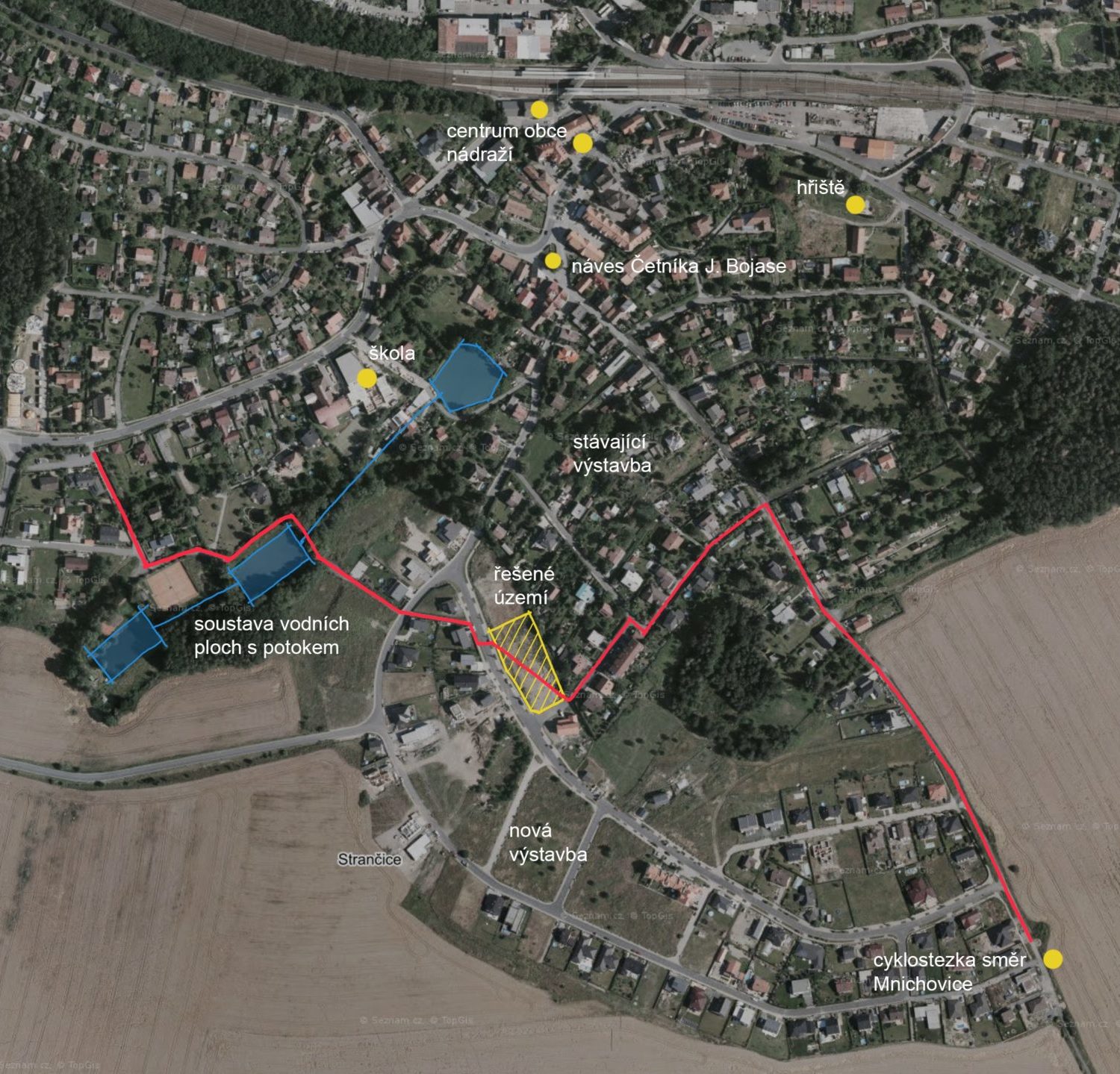Svoji polohou představuje řešené území spojovací bod na pěší trase mezi fotbalovým hřištěm, bývalým koupalištěm, tenisovými kurty, rybníkem na potoku Čerávka a cyklotrasou č. 0020 vedoucí ulicí Na Vráž směrem do Mnichovic. Od kurtů k ulici Pod Horkou tak vzniká prostor primárně sloužící pěším o celkové délce 450m. Díky svojí blízkosti nádraží a centru obce – docházková vzdálenost 10 minut – může prostor sloužit všem obyvatelům Strančic.