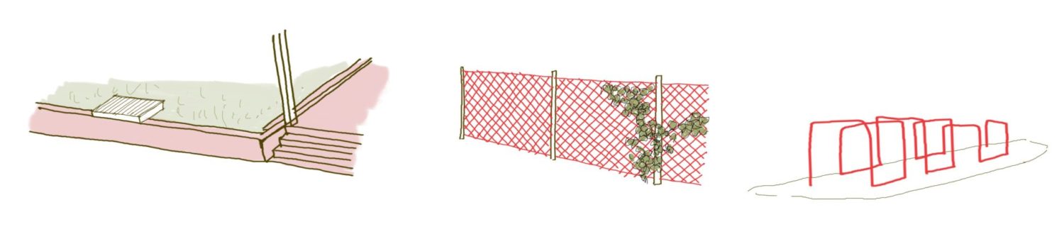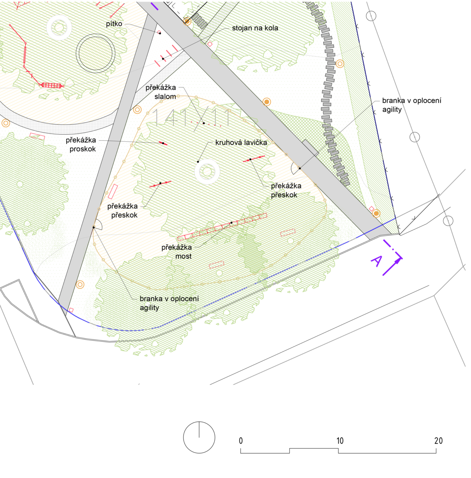 Při altánu je umístěno pítko a stojan pro kola. Posilovací prvky (hrazdy a lavice) a stůl pro pingpong v jižní části parku budou ze stejného materiálu jako agility prvky – ocel doplněná červenou barvou.