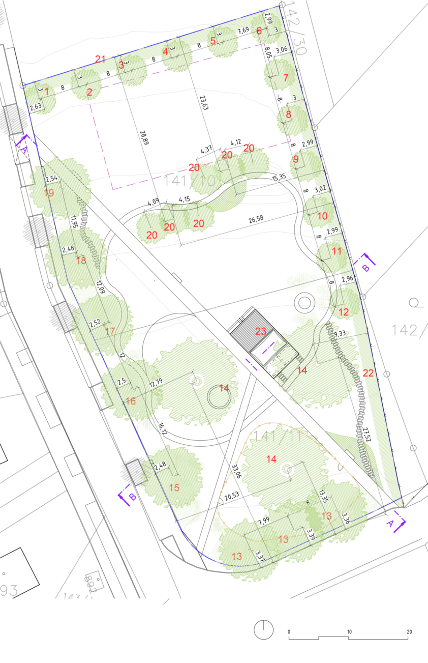 Duby červené zas především posílí pestrost podzimního aspektu (budou svojí výrazně červenou barvou doplňovat žluté a potom hnědé duby letní), navíc jsou osvědčeným a odolným alejovým a parkovým stromem. Stromořadí, které je při hraně se sousedními zahradami, je navrženo z různých druhů ovocných stromů. Ty připomínají původní vesnickou krajinu obce. Mezi stromořadím a okrajem pozemku je navržen keřový pruh, aby plody a listí ze stromořadí nepadalo na zahrady sousedních domů.