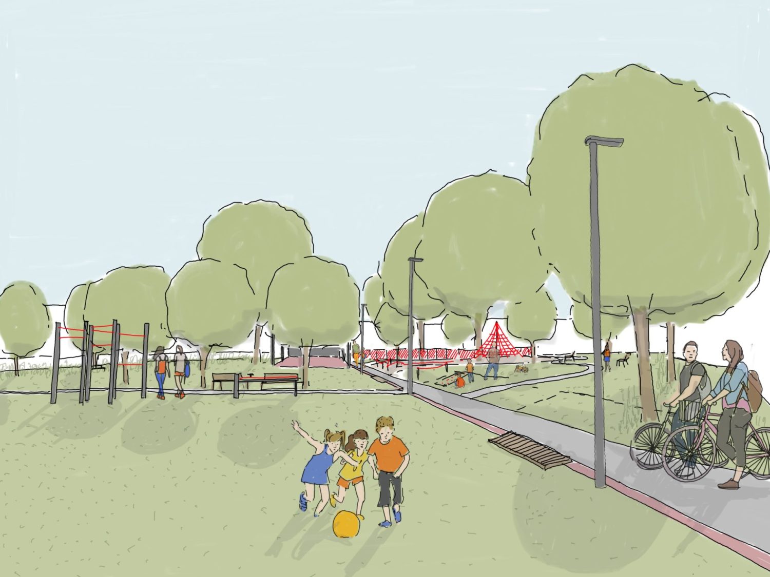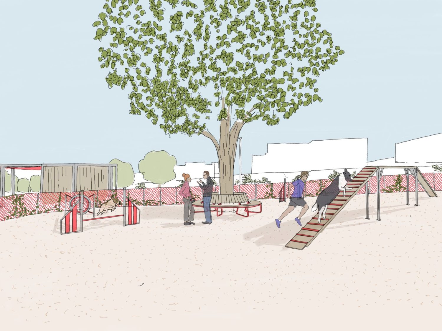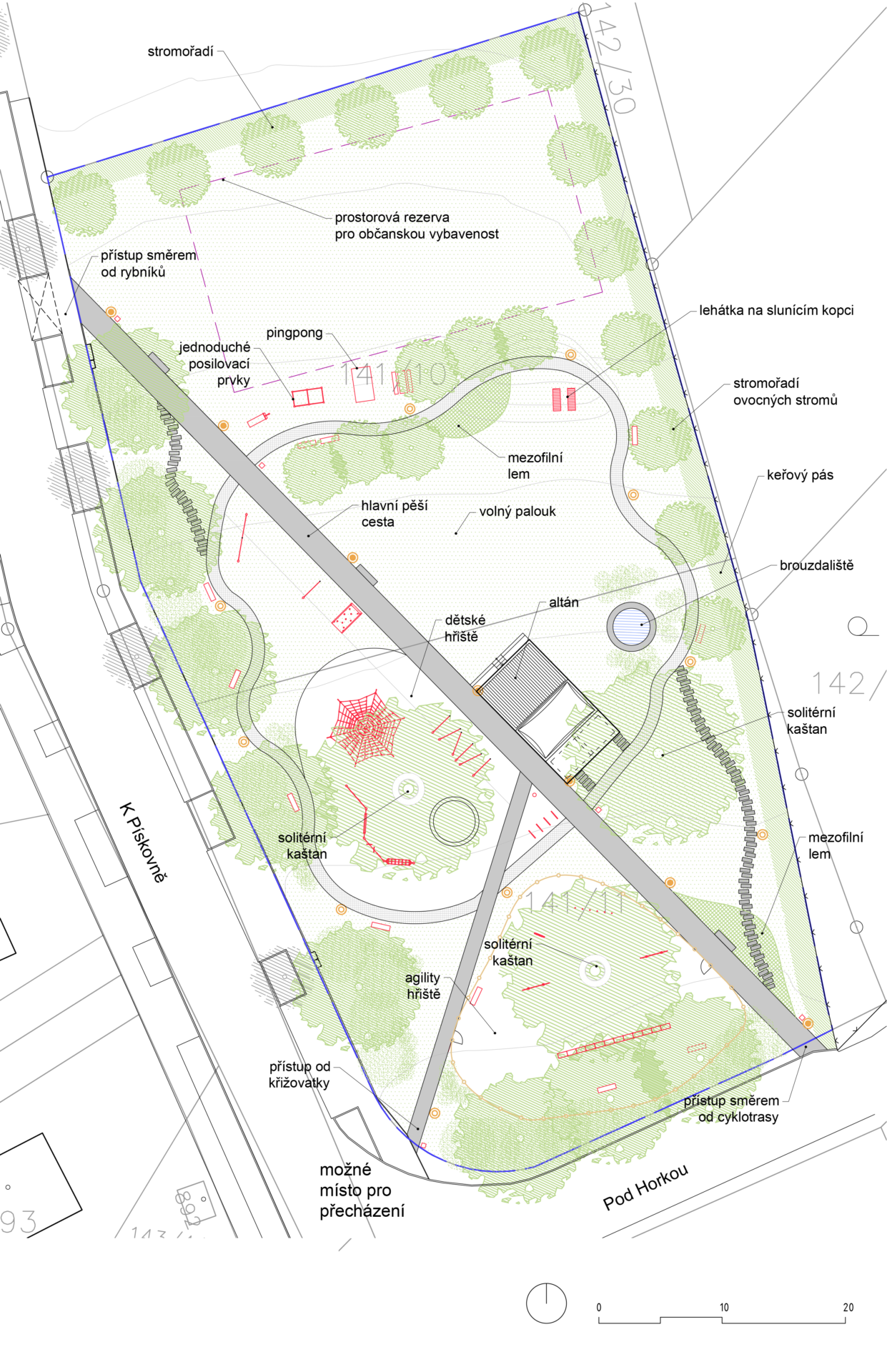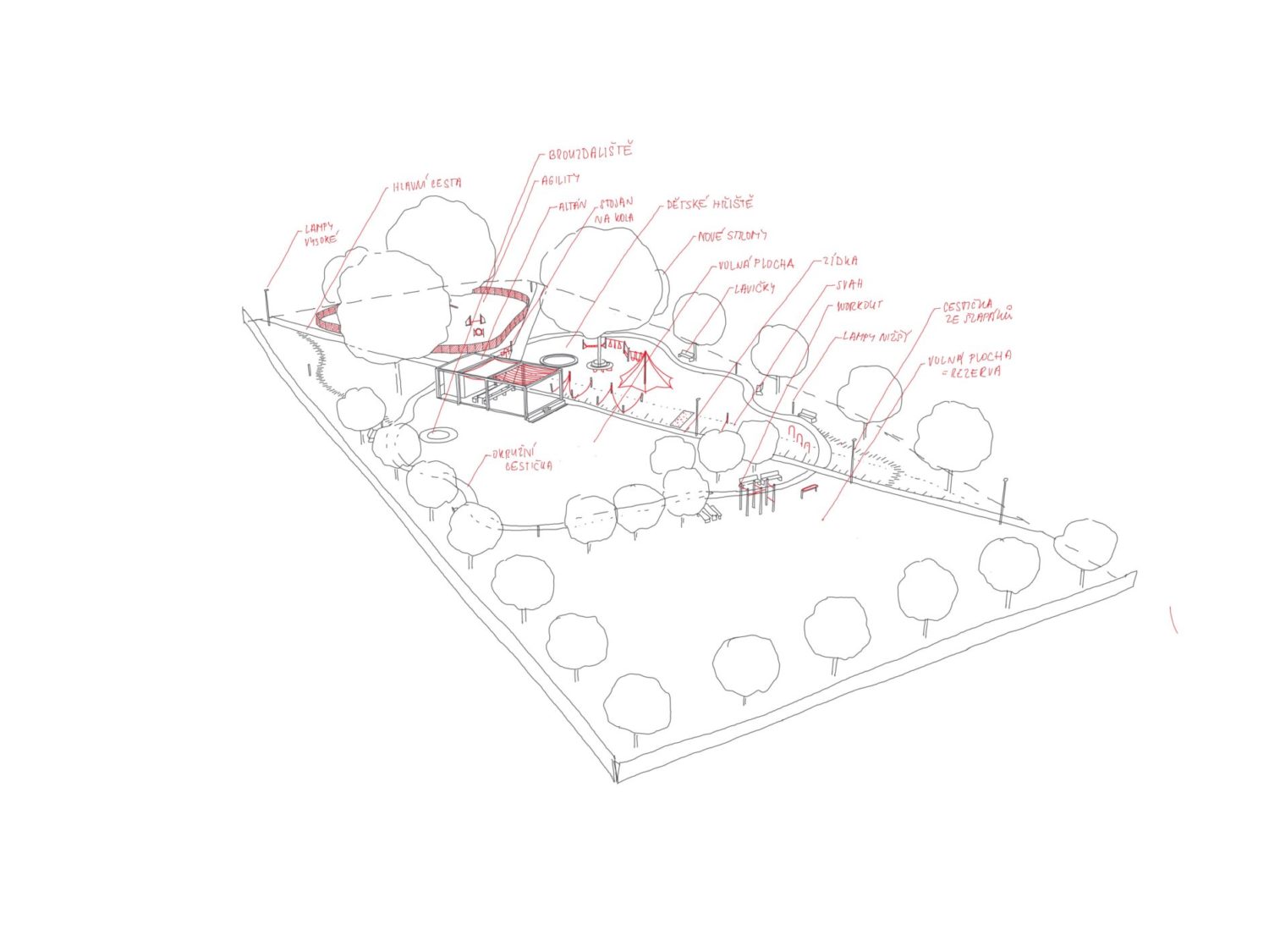 Hlavní pěší komunikace rozděluje prostor na dvě části. První, více kompaktní a zahuštěná při kontaktu s ulicí obsahuje obě hřiště – dětské i pro psy a slouží jako prostorové oddělení parku od okolních komunikací. Díky tomu může být druhá část parku intimnější, bezpečnější a může být i otevřenější. Na volném palouku je místo pro rozličné pohybové aktivity, ale i pro lenošení na trávníku. Cílem je vytvoření co možná nejvíce prostupného a otevřeného prostoru, proto zde až na výjimku psího hřiště nenavrhujeme žádné ploty.