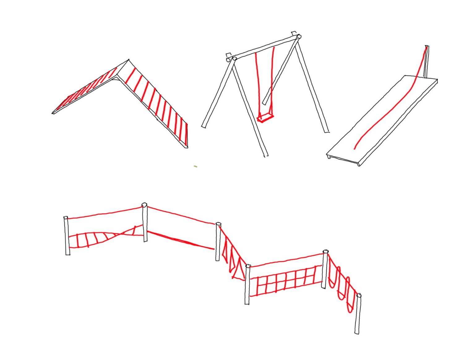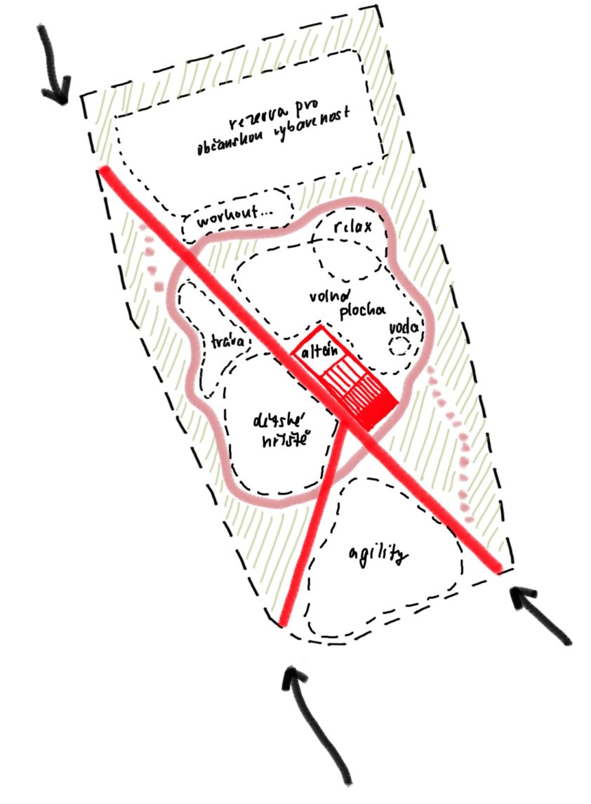 Altán je možné si rozdělit na pomyslné tři části, z nichž první je zcela uzavřená a pevná a skrývá v sobě sklad sportovních potřeb nebo i technického náčiní a také veřejnou toaletu. Druhá část je venkovní, ale pevně krytá textilií například proti dešti nebo slunci. Sem také navrhujeme umístit dlouhý piknikový stůl nebo sérii několika stolů za sebou pro větší počet lidí. Třetí část již není zcela krytá, ale její „střechu“ tvoří lanka, za která se může zavěsit například houpací sít/křeslo, můžou se po ní pnout rostliny jako např. břečťan nebo akébie, tato část rozšiřuje pobytovou plochu altánu.