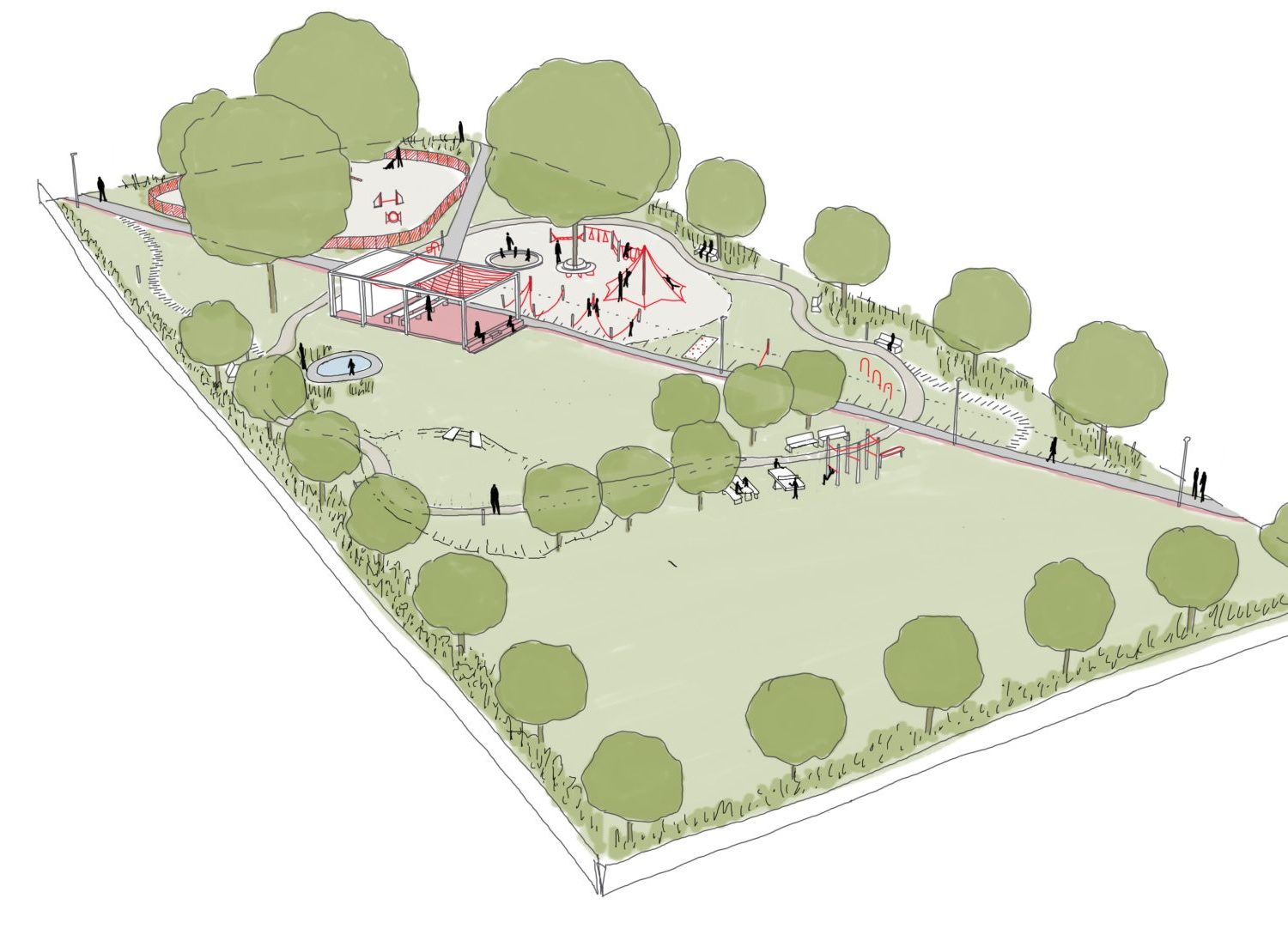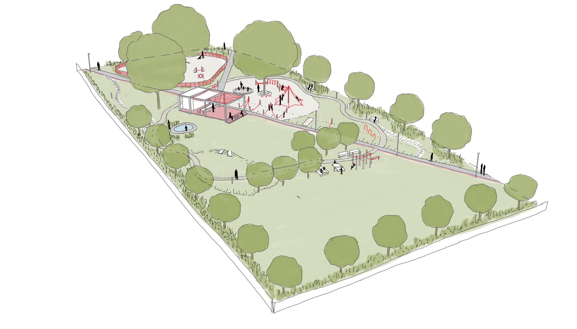 V návrhu klademe důraz na to, aby park dobře zapadnul do svého okolí. Dvě různě široké komunikace vycházející ze stávajícího urbanistického uspořádání cest v území prořezávají terén a tvoří jakousi kostru parku. Kolem nich potom obíhá ve zvlněném kruhu menší cesta pro odrážedla zpřístupňující ostatní části parku. V rámci tohoto organismu se potom nacházejí jednotlivé zóny, aby si v parku přišel každý na své. Park je tak jakýsi organismus sám o sobě s jednoduchým a logickým členěním, které se zároveň obrací k okolí a respektuje sklon terénu. Charakter parku je také definován v rámci práce s detaily prvků mobiliáře a s povrchy.