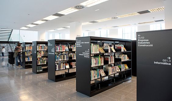 Knihovna je umístěna v klidnější části budovy, vstupuje se do ní společným vchodem s ordinacemi. Při vstup je umístěn pult pro pracovníky, odkud mají přehled o dění v knihovně. Regály s knihami jsou umístěny na kolejnicích tak, aby je bylo možné v případě potřeby všechny posunout na severovýchodní stranu a tím vytvořit jeden velký prostor společně s KC.